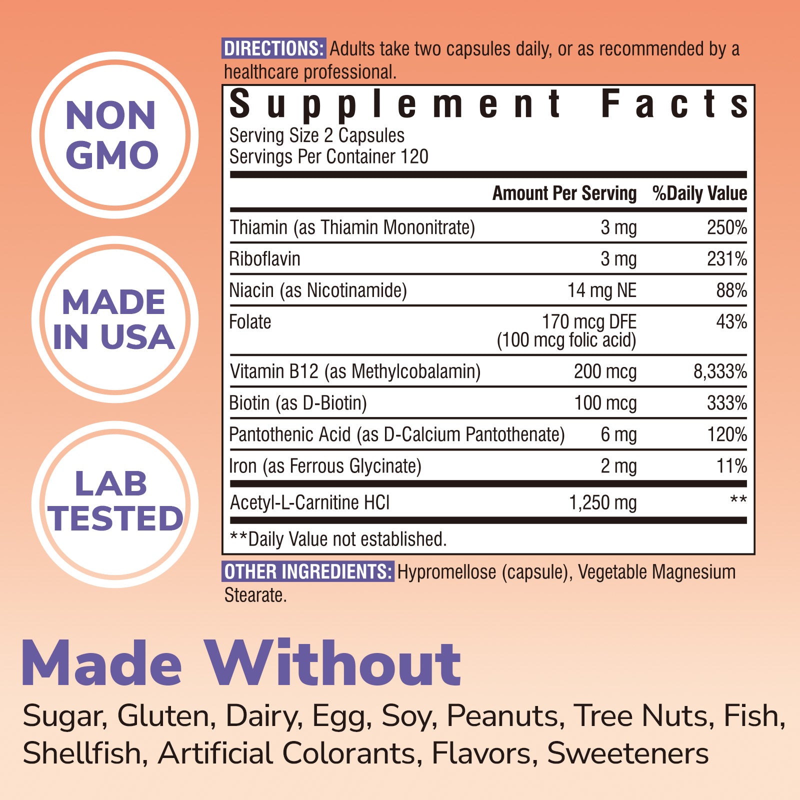 1250 mg of ALC Per Serving Full Spectrum B Vitamins Bioavailable D-Biotin & Methylated B12 Flush-Free Nicotinamide Enhanced with Iron