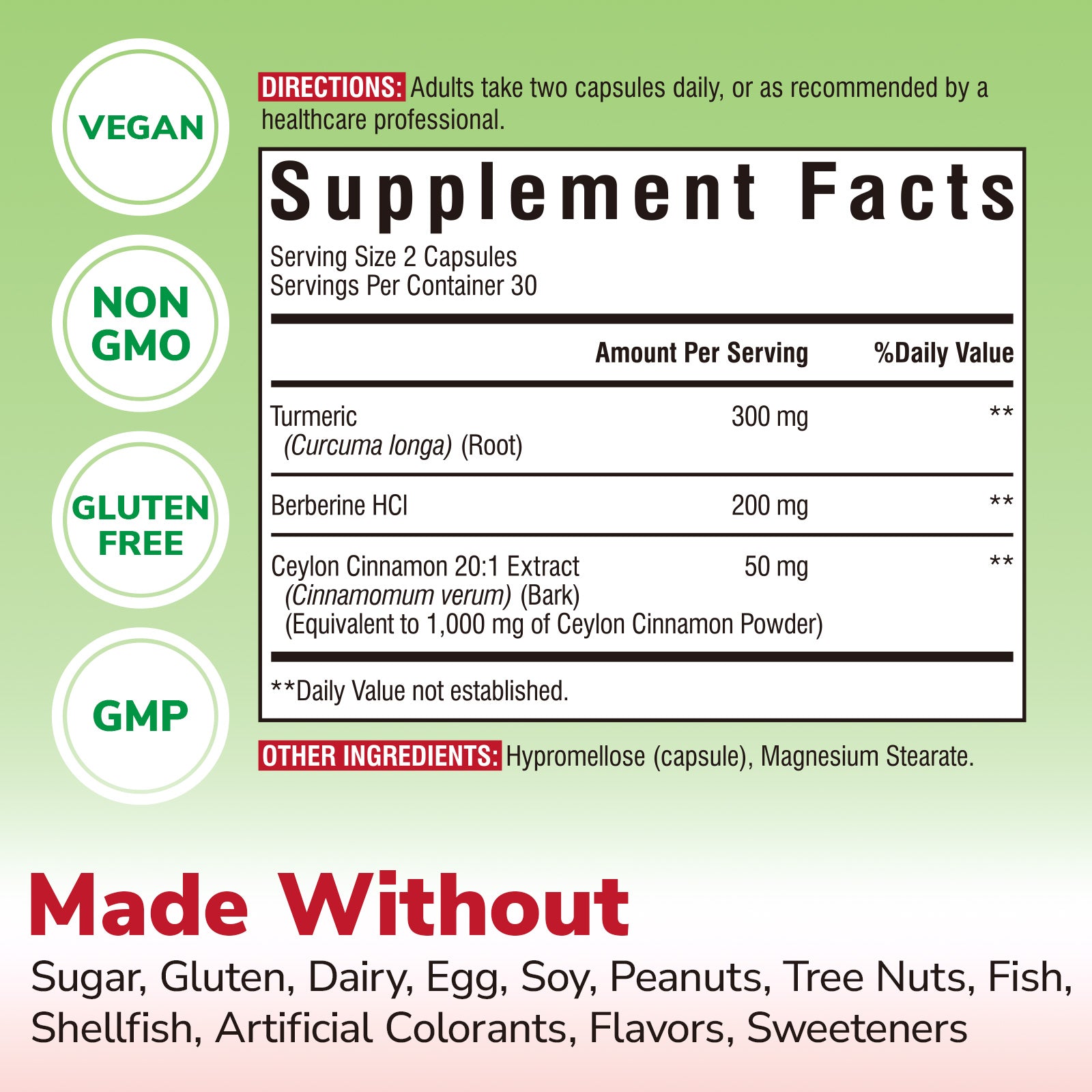 INGREDIENTS: Berberine, Turmeric, Ceylon Cinnamon.