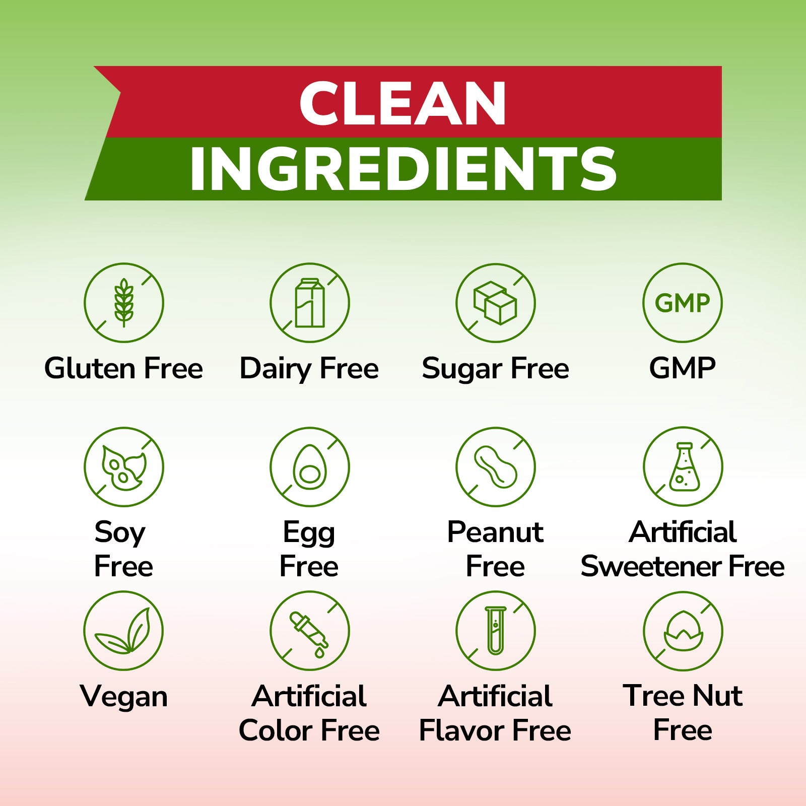 NO: Sugar · Gluten · Dairy · Eggs · Soy · Peanuts · Tree Nuts · Fish · Shellfish · Artificial Colors · Artificial Flavors · Artificial Sweeteners.